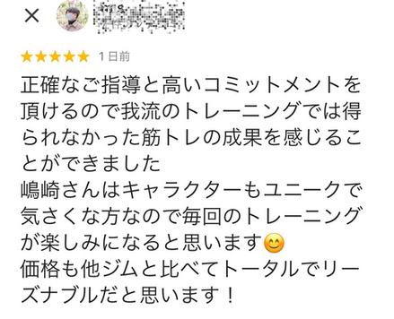 40代になってから体力の衰えを感じ始め、自分では何ともならない体重に、思い切ってシマザキジムに通い始めました。 最初は一人で行くのが不安でしたが、トレーナーさんは、どの方もとても丁寧な言葉遣いで接してくださいます。 安心してトレーニングに集中できました。 ジムは、いつも清潔感があり、女性1人でも通いやすいのが魅力です。 でもトレーニングは想像以上にストイックで、毎回妥協は一切なし。ですがその分、身体が変わっていくのが嬉しくて、通うのが楽しみになっています。 トレーニングも食事も、いつも応援してくれるので、やる気も続きます! また、パーソナルでは珍しく、会員同士の交流イベントもあったり、楽しく続いています。 今では息子もペアトレで一緒に通い始めました! 楽しく、しっかり結果を出したい方にはオススメです!